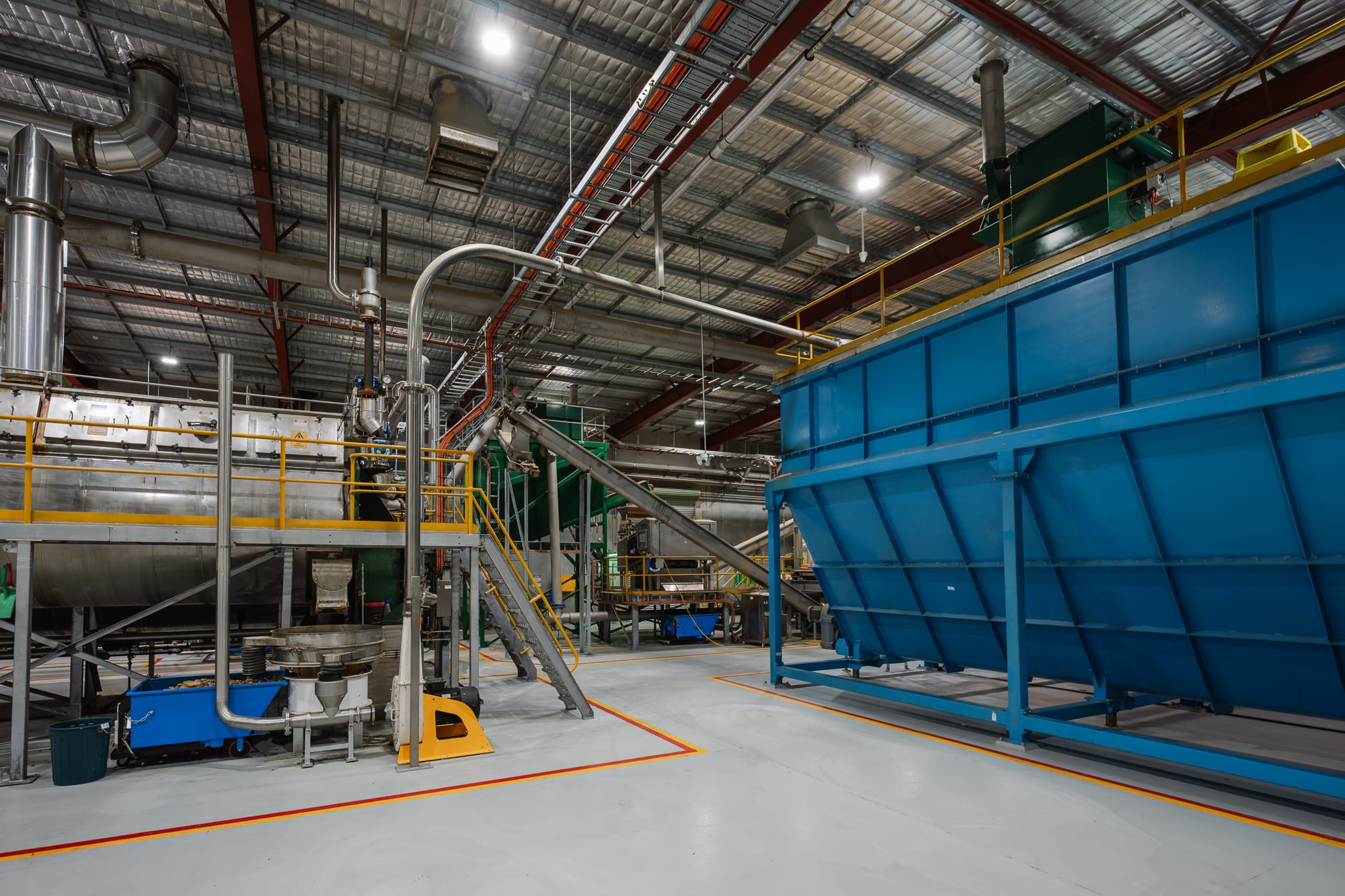 Odours are reduced by over 90% through collection at source and treatment in dedicated biofilter beds. An integrated receival and washdown area means raw materials can be unloaded inside the building, reducing the risk of fugitive emissions.